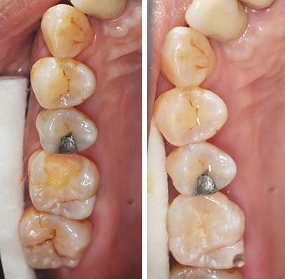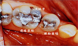 傳統金屬材料(銀粉)會熱脹冷縮,而且無法與琺瑯質連結在一起,太大的缺損在填補後經過一段時間容易與牙齒分開,導致二度蛀牙,導致齒質再破壞。