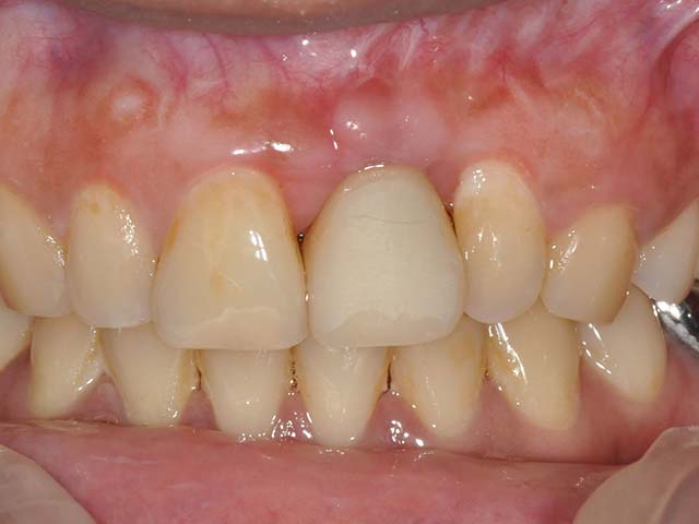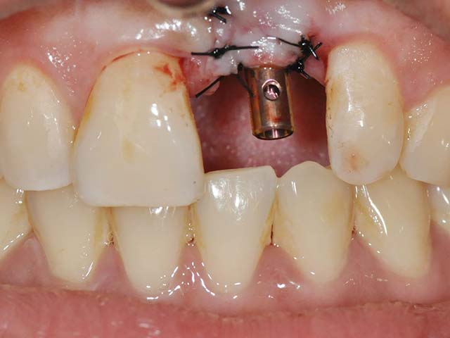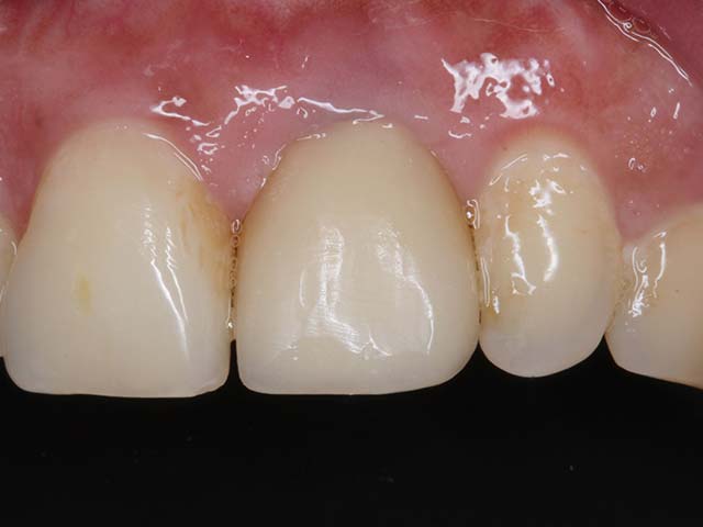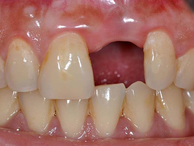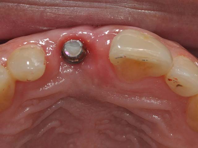 前牙審美植牙 首頁 案例分享 人工植牙 前牙審美植牙 前牙審美植牙 彭小姐於小時候不小心撞斷牙齒了,當時植牙風氣並不盛行,又不想修磨鄰牙,只好以活動假牙替代,導致骨頭吸收,牙齦萎縮。 缺牙10年以上,組織塌陷 植入植牙 術後兩周,傷口癒合良好 使用臨時假牙,雕塑牙齦 五年追蹤,軟組織保持良好